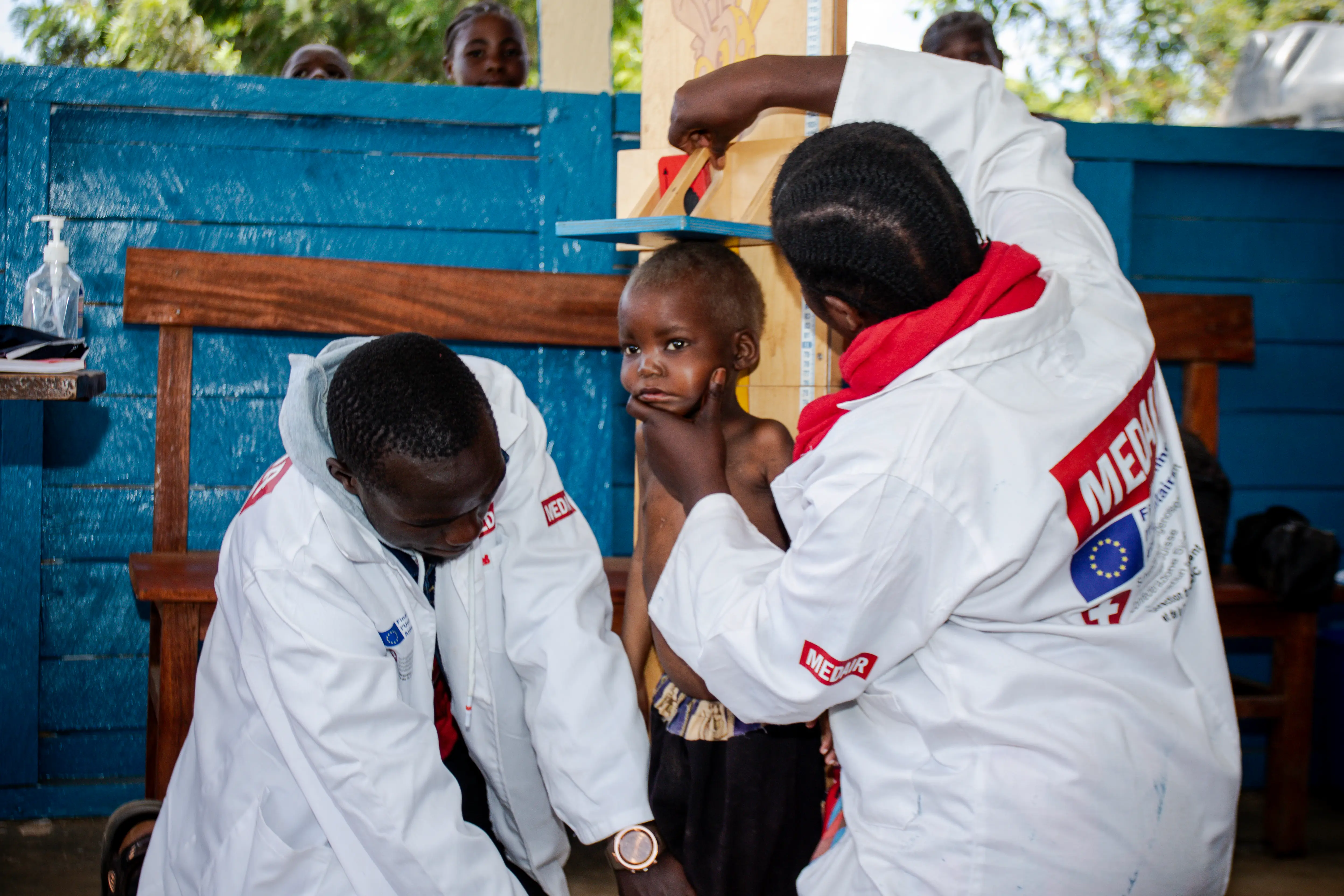 Upon arrival, Nzila, a nurse, welcomes the mother and child, and carries out the first anthropometric measurements. She checks Donsi’s upper arm circumference, weight, and height. The diagnosis is severe: acute malnutrition with medical complications – a serious case that cannot be treated at the OTP (Outpatient Therapeutic Programme); it requires specialised medical supervision at the SC (Stabilisation Centre).